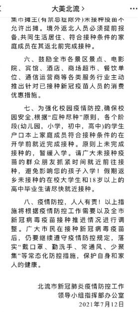 7月12日,廣西桂平市新型冠狀病毒肺炎疫情防控指揮部發(fā)出通告:凡年滿18周歲以上(戶籍不限)且無(wú)疫苗禁忌癥的人員均須接種。為強(qiáng)化校園疫情防控,確保校園安全,根據(jù)“應(yīng)種盡種”原則,各個(gè)階段(幼兒園,小學(xué),初中,高中)的學(xué)生戶口本上家庭成員符合接種條件的在開(kāi)學(xué)前就近完成接種。原則上未完成接種的,暫緩入學(xué)。